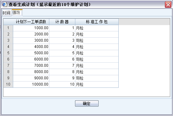 通过查询找到需要查看维护计划的条件型预防性维护单据,如果在列表状态,点击〖卡片显示〗按钮,切换到卡片状态下,然后选中“绩效频率”页签的一条数据,点击〖辅助功能〗-〖查看维护计划〗按钮,系统弹出查看维护计划的界面。该页面有两个页签,分别是以时间为纬度的维护计划和以绩效参数为纬度的维护计划。每个纬度显示最近的10个维护计划。可以查看预防性维护按照设定的生成频率生成的下一工单读数、所使用的标准工作包以及计数器数据。